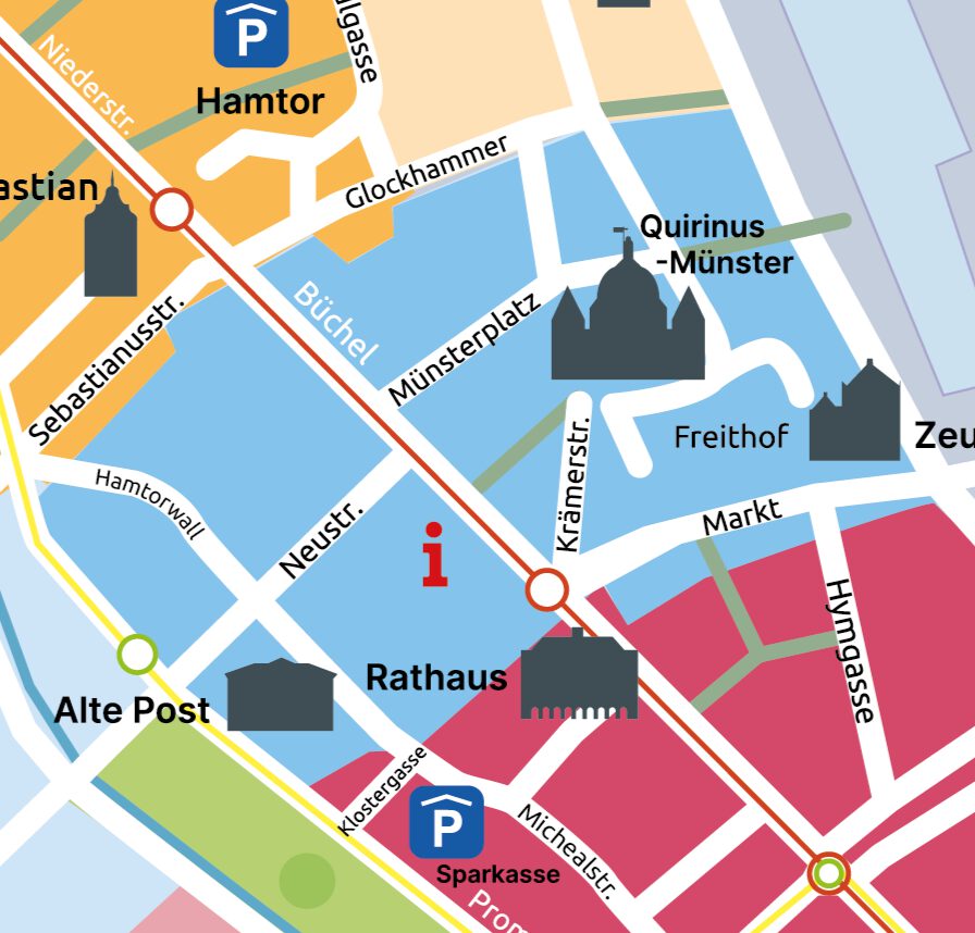Direkt am Bahnhof gelegen und damit der ideale Einstieg in die Neusser Innenstadt. Das Viertel bietet viele Angebote für den täglichen Bedarf, schnelle Besorgungen und eine gute Auswahl an Hotels.